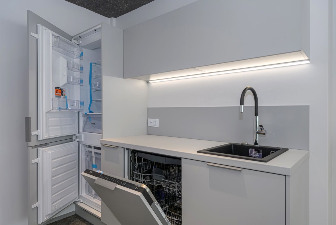 Pakutavast pinnast osa on värskelt renoveeritud. Paigaldatud on uus põrandakate, seinad ja laed värvitud, täielikult uuendatud WC-d ja duširuum ning köögis on uhiuus mööbel ning tehnika. Ülejäänud pind on heas korras.