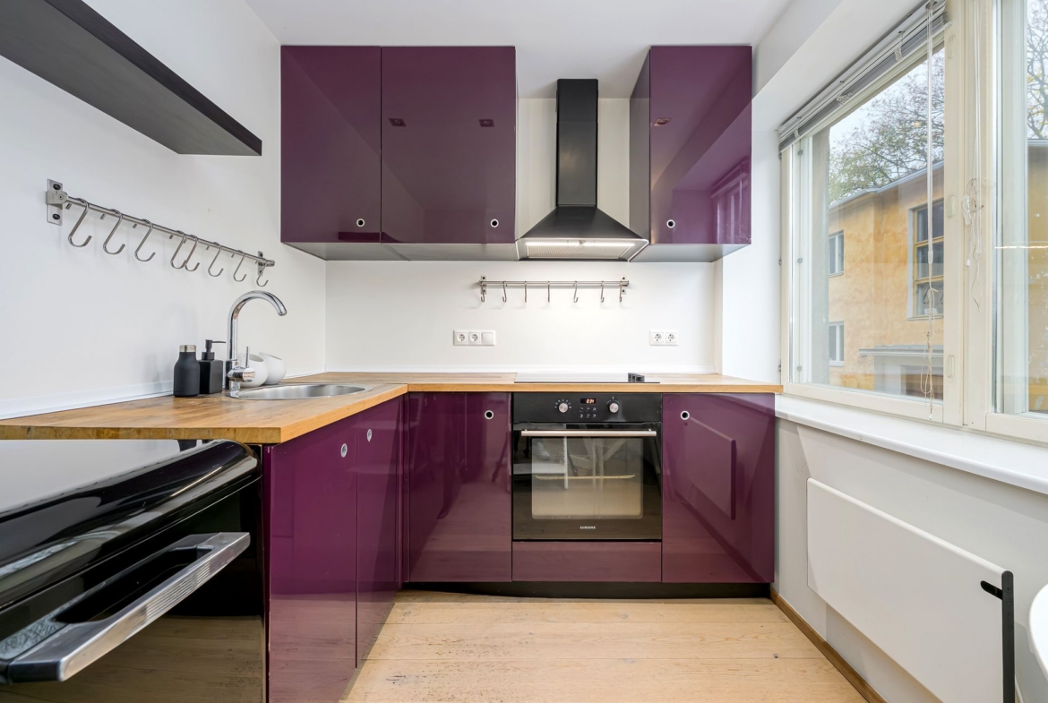 Õdusas köögis on kõrgläikega pilkupüüdev köögimööbel, mis sobib valatult antud korterisse.