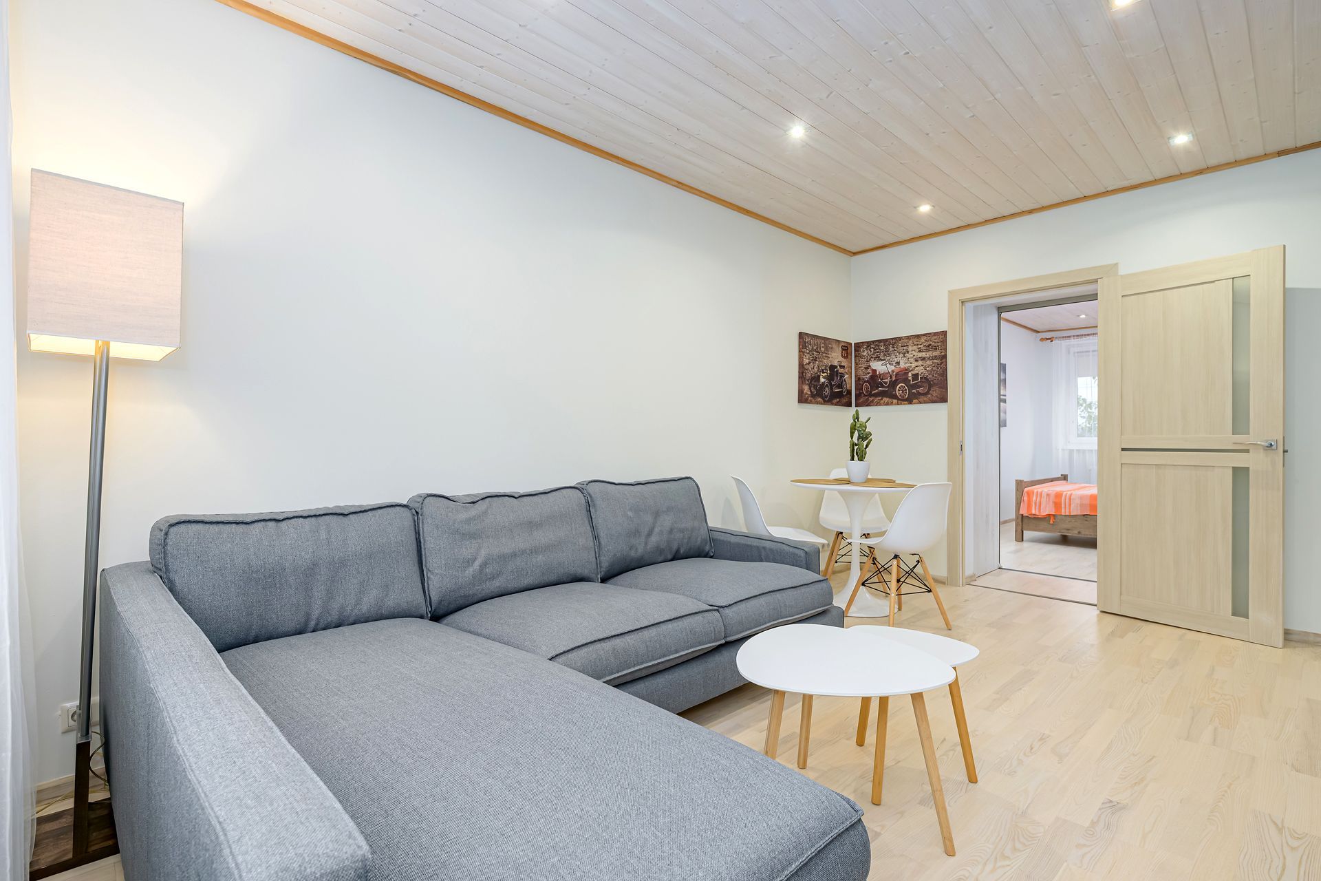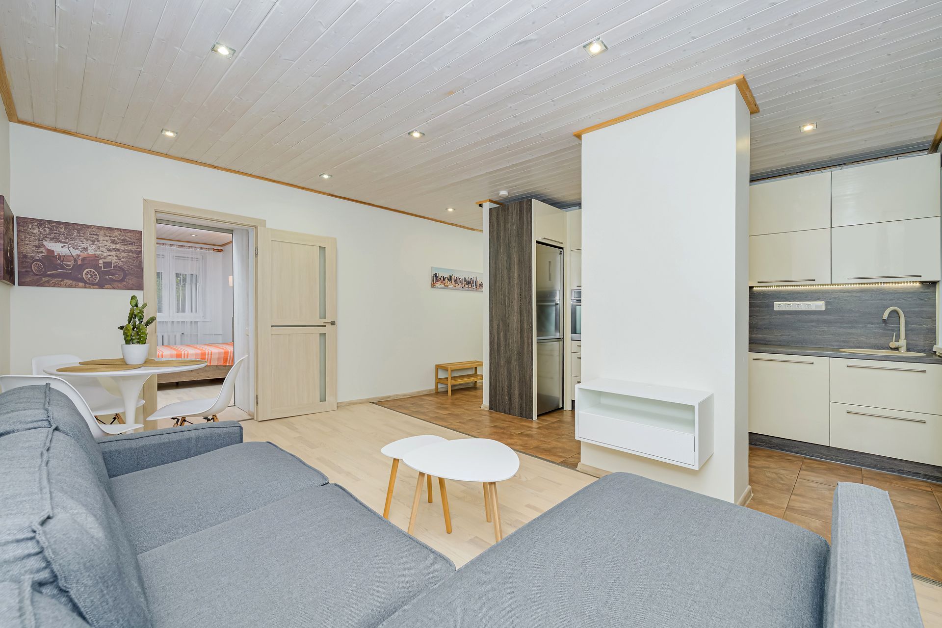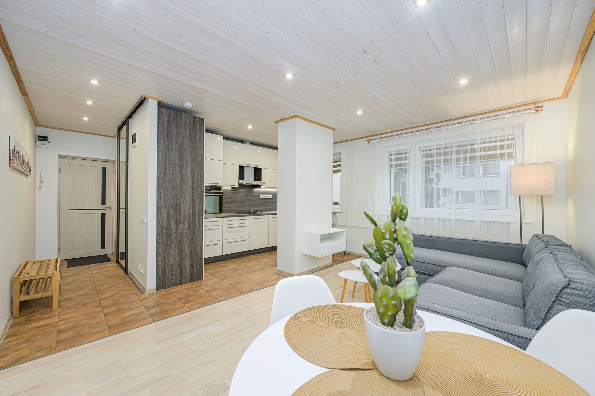 Avatud suur ja valgusküllane elutuba, maitseka diivani ja heleda laua ning toolidega.