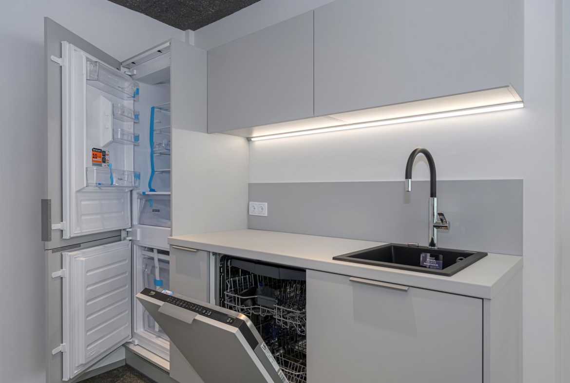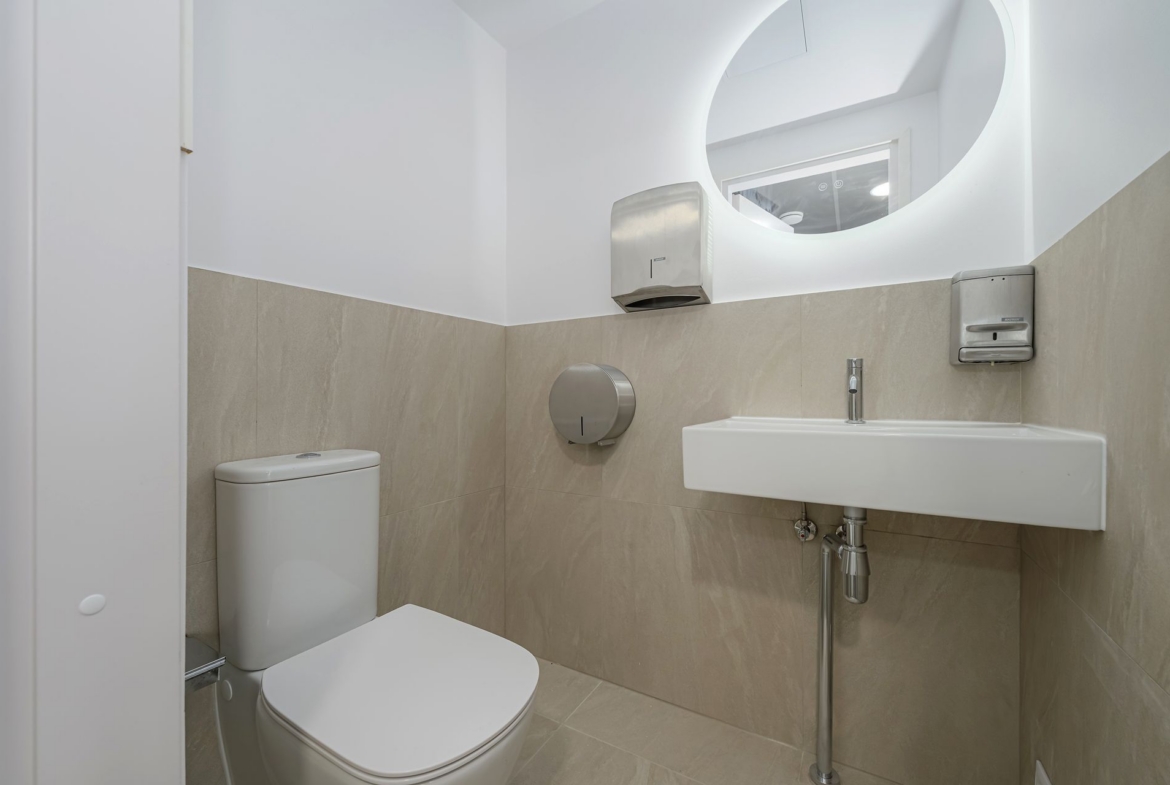 Pakutavast pinnast osa on värskelt renoveeritud. Paigaldatud on uus põrandakate, seinad ja laed värvitud, täielikult uuendatud WC-d ja duširuum ning köögis on uhiuus mööbel ning tehnika. Ülejäänud pind on heas korras.